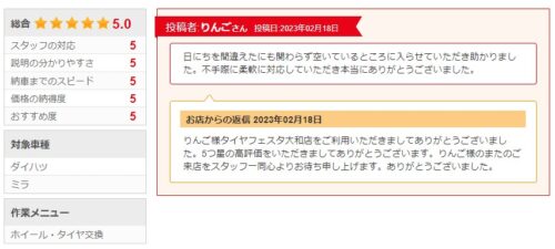 グーピット りんごさん5つ星レビュー タイヤフェスタ大和店 関連記事:スバルWRXのタイヤ交換 タイヤフェスタ大和店C-HR タイヤ交換 タイヤフェスタ大和店スバル R2 タイヤフェスタ大和店 タイヤ交換スバル インプレッサ タイヤフェスタ大和店タイヤフェスタ大和店 トヨタ カローラツーリングのタイヤ交換