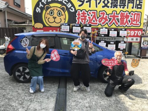 湘南平塚店♪寒川町H様 HONDA フィットのタイヤ交換を承りました♪決め手は「近さ」♪スタッフとパチリもご一緒に!!