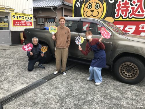 2025.12.03 湘南平塚店♪平塚市T様 TOYOTA ハイラックス のタイヤ交換を承りました♪決め手は「家から近いから」♪スタッフとパチリもご一緒に!!